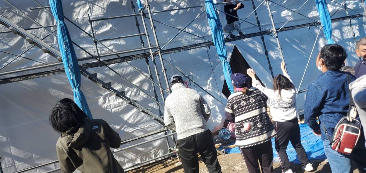 3号館に入居予定のH君とM君も、上にあがり、お餅をまくお手伝い。