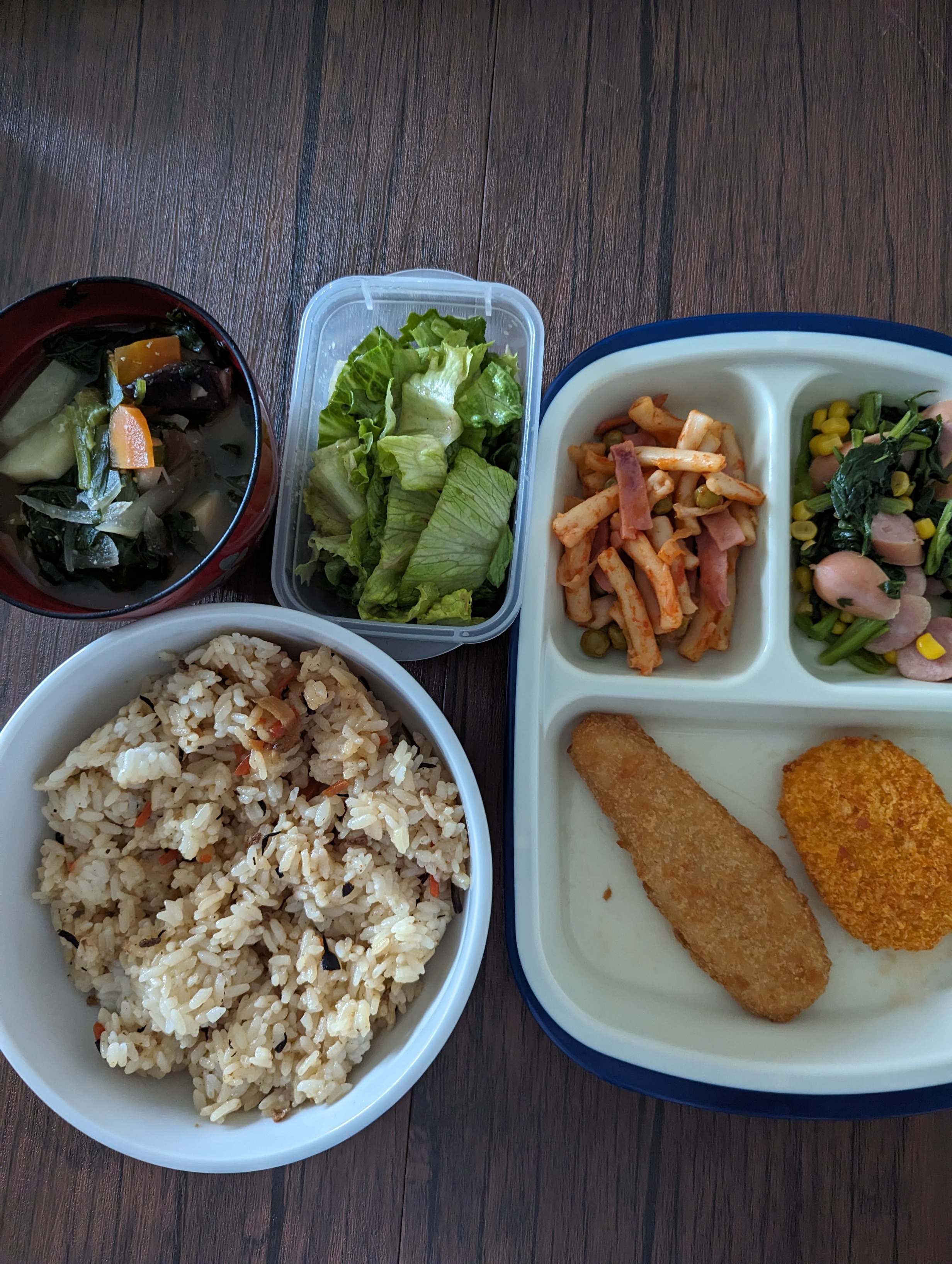 味ご飯、Mファームから届いた野菜たっぷりのお味噌汁、サラダが、いつものご飯にプラスされていました。