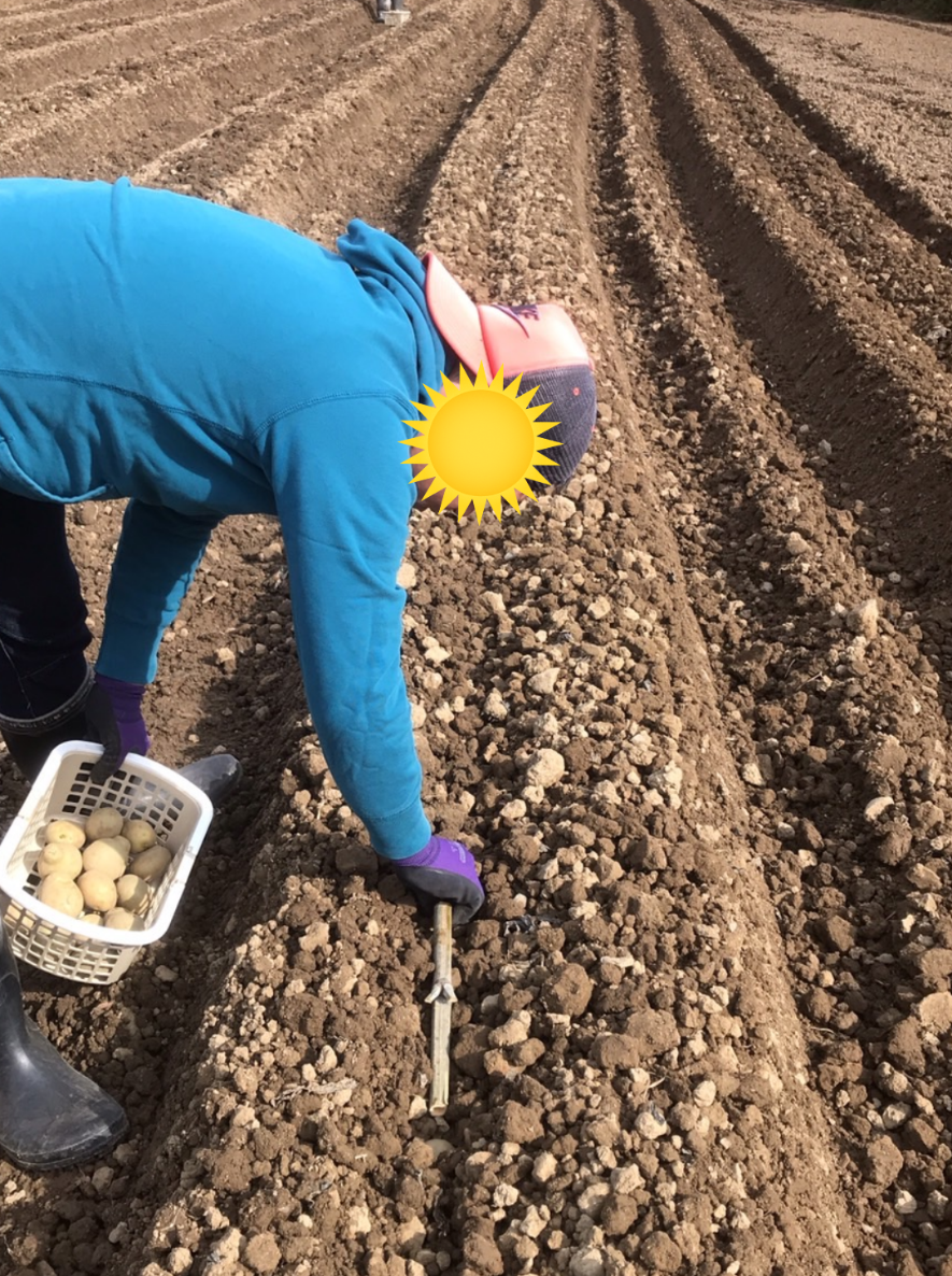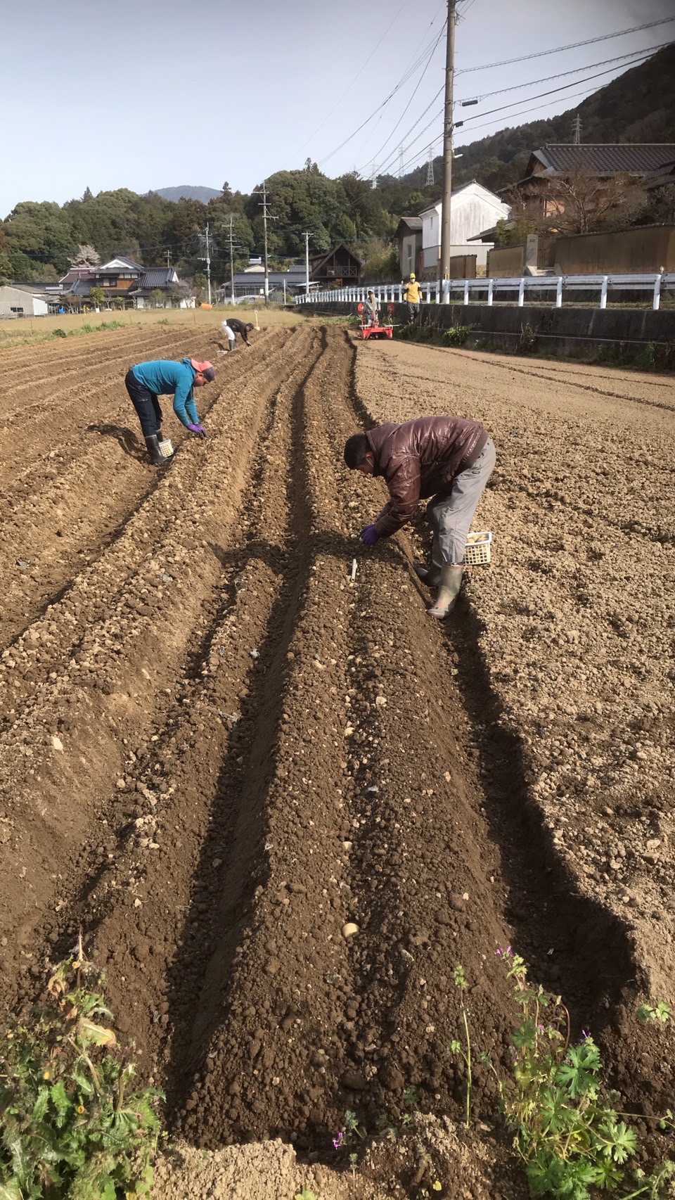 前回のブログで書いた、Kくんが作ってくれた畝に、Mファームのメンバーが、どんどんじゃがいもの種いもを植えて行っています。