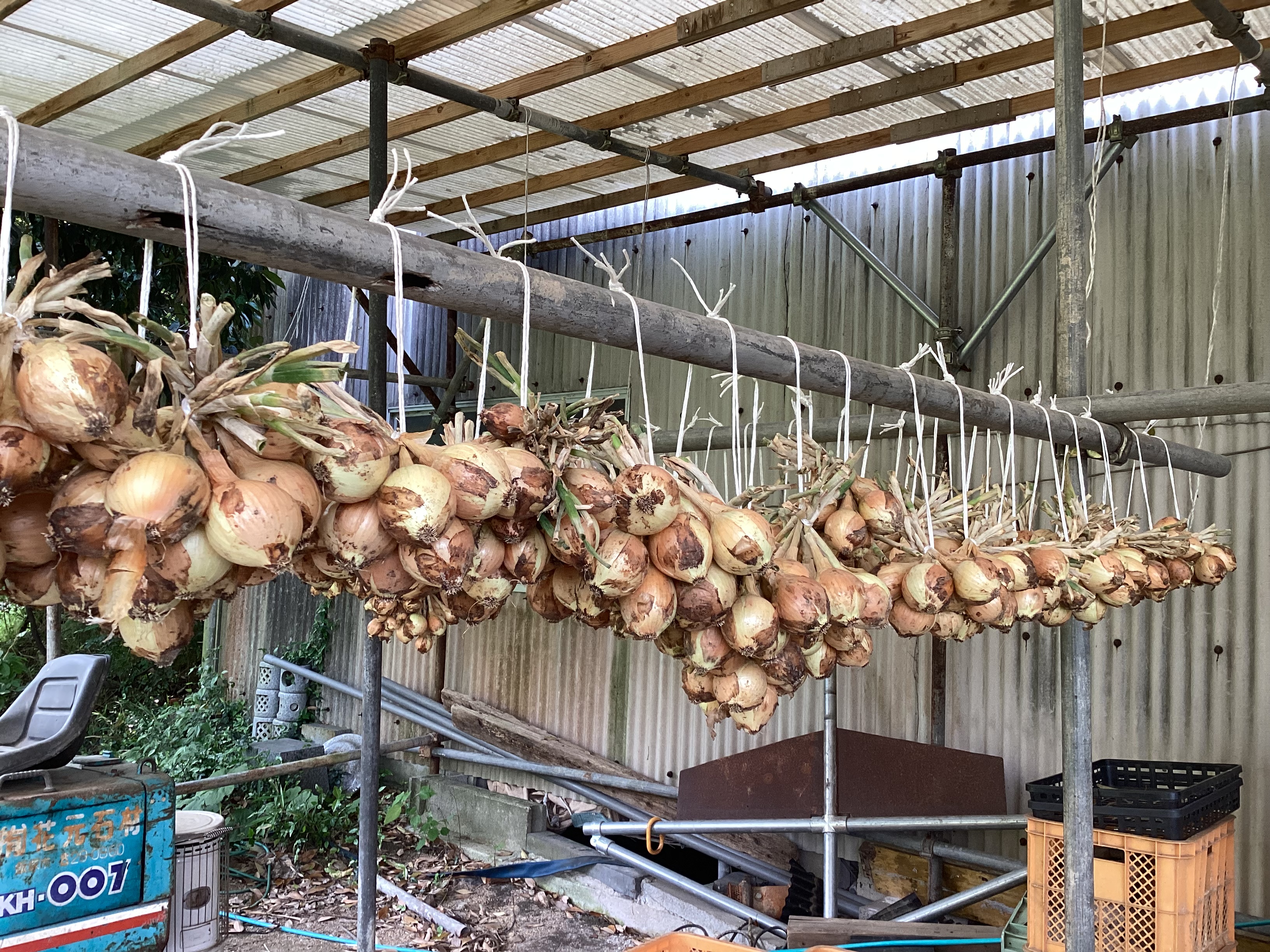 Mファームで育てていた玉ねぎを収穫して、日持ちするよう、軒下に吊るします。