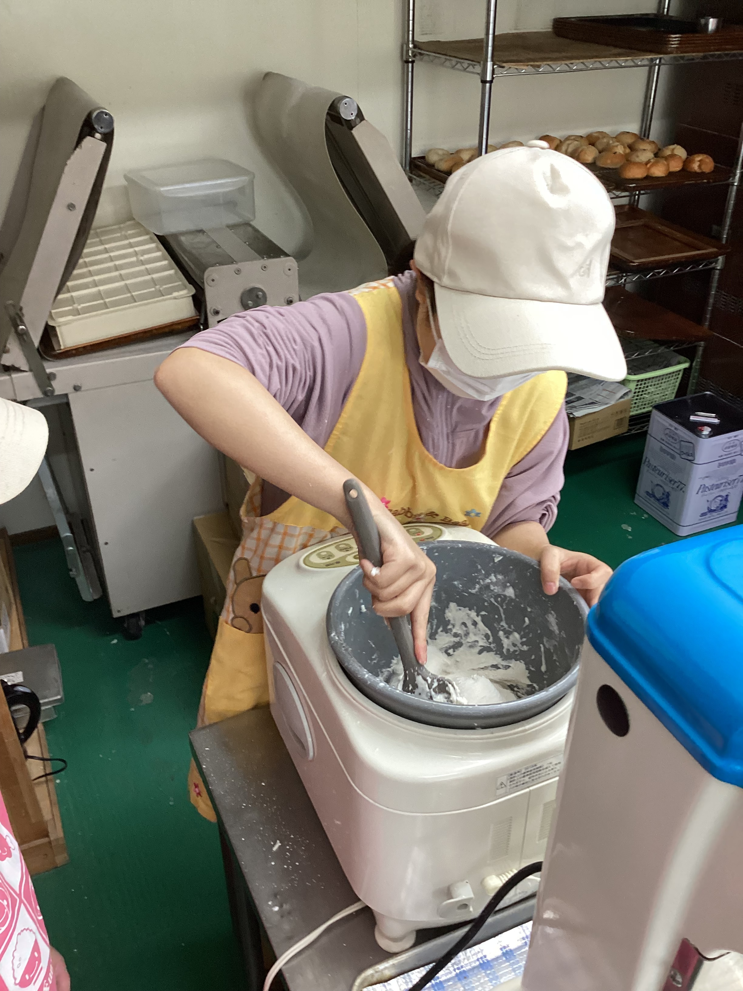 写真は、生米のお菓子やパンを作るための作業をしています。