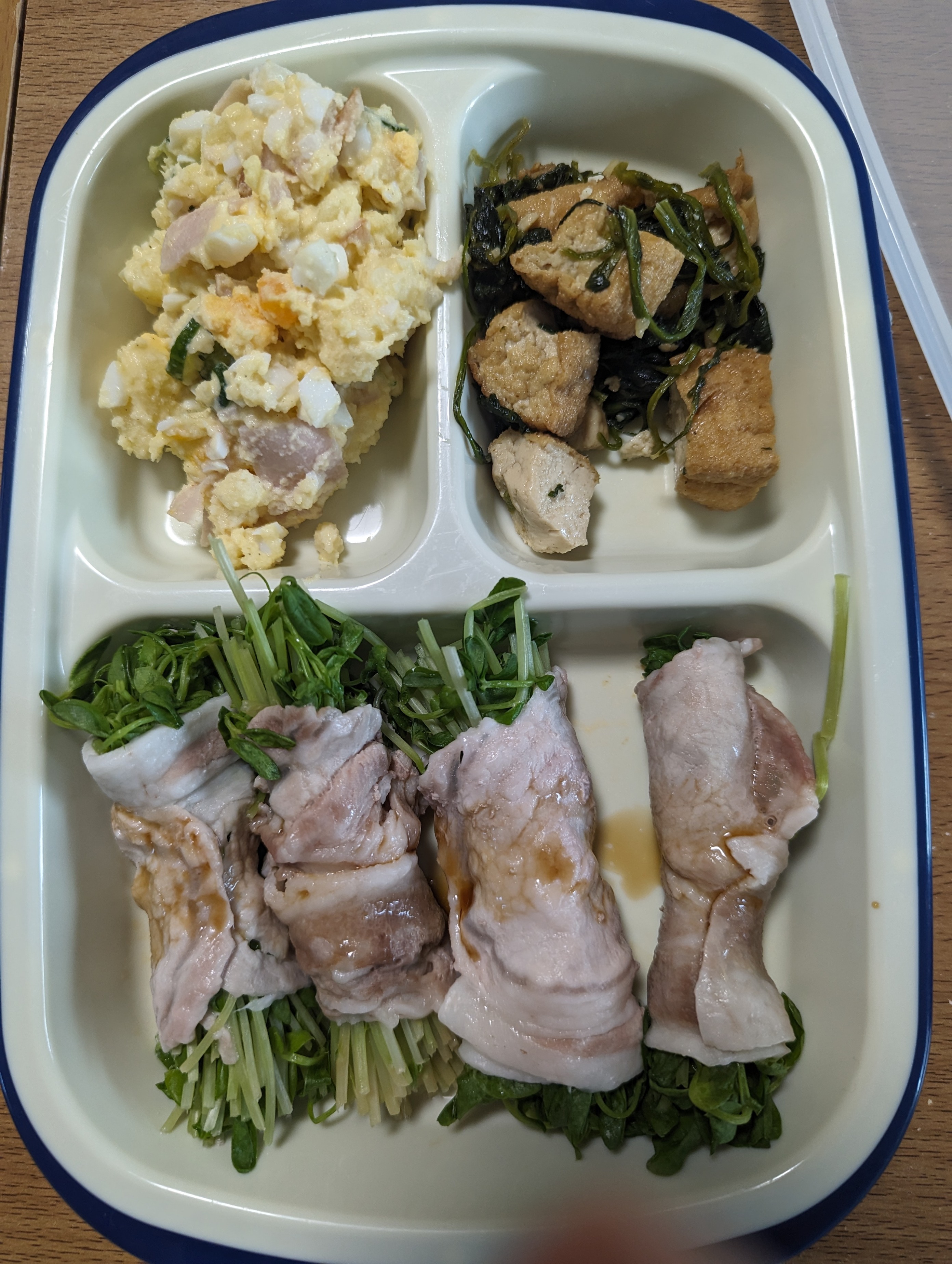 この日は、豆苗の豚肉巻、ポテトサラダ、小松菜と厚揚げの煮物 でした。