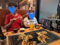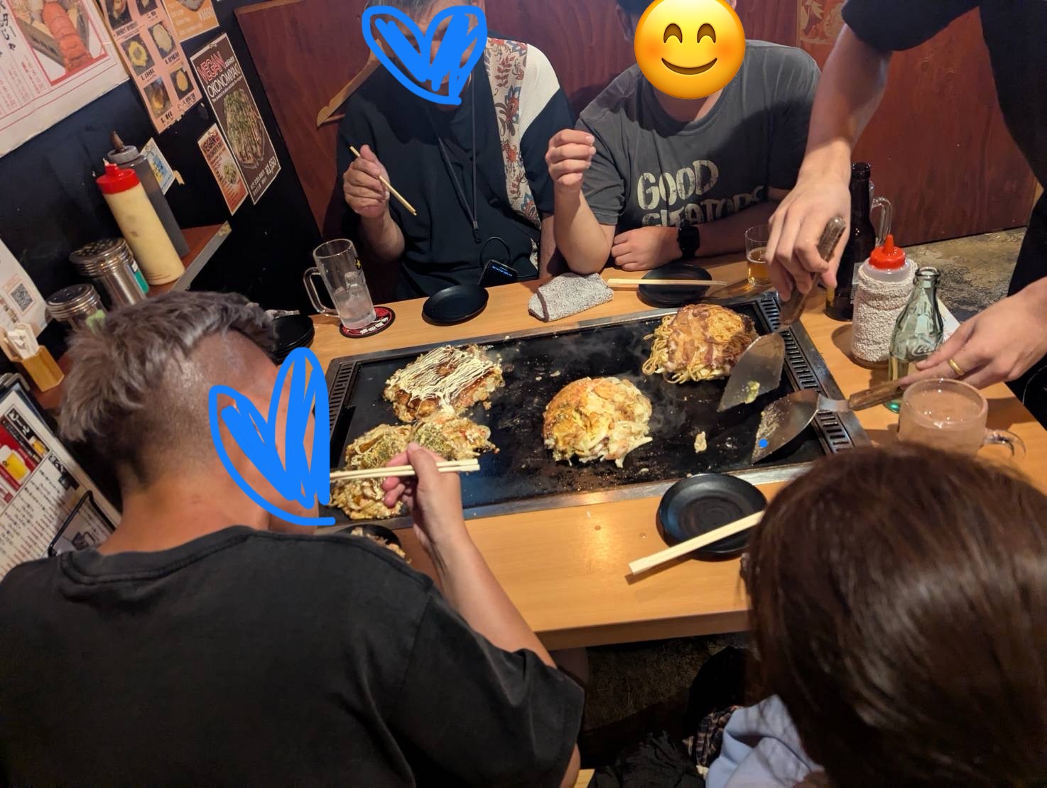 雨が降り出したため、ホテル近くの店に変更しましたが、みんな、楽しそうに焼いてました。