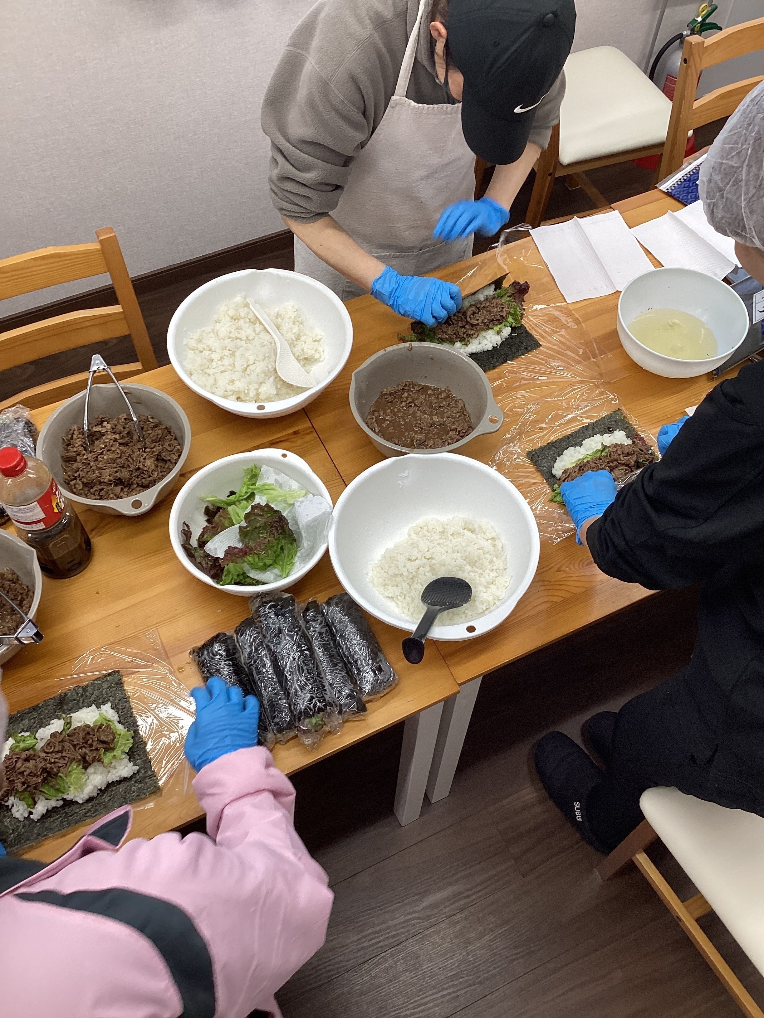今年の恵方巻きは、お肉を焼肉のタレで味付けし、サニーレタスと一緒に巻く「キンパ風」でした。