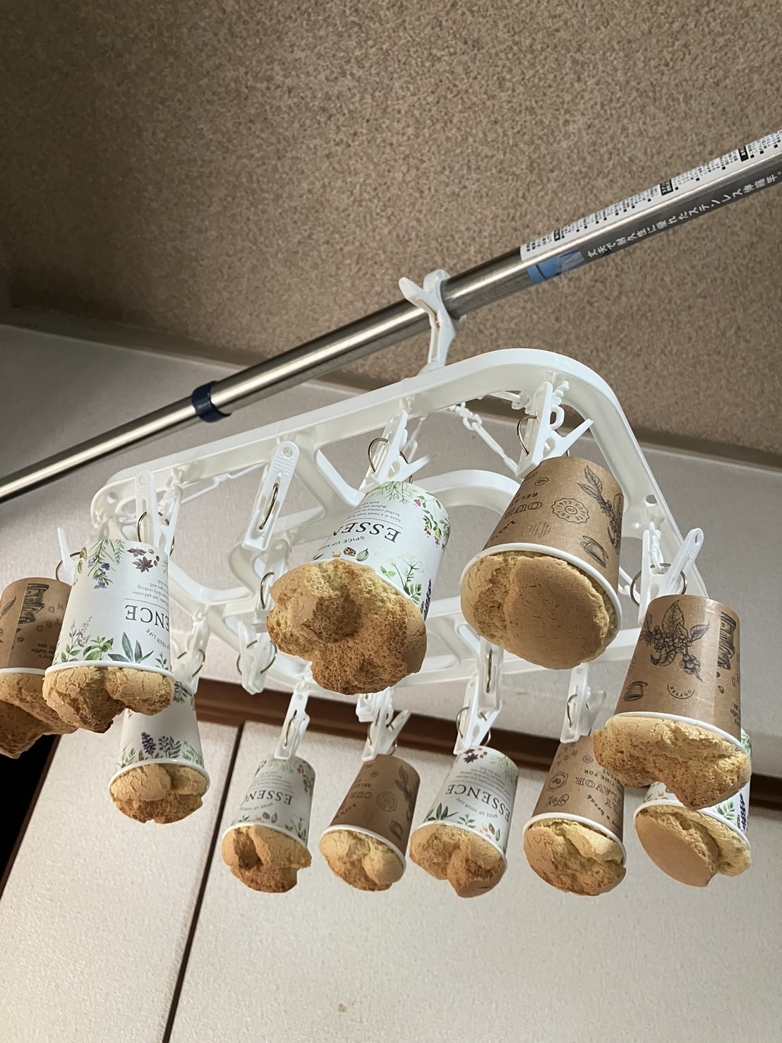 シフォンケーキは、焼きたてを逆さまにしないと、しぼんでしまうため、どのようにしようかと、アレコレ考えていたところ、SNSに、この方法があがっていたそうです。